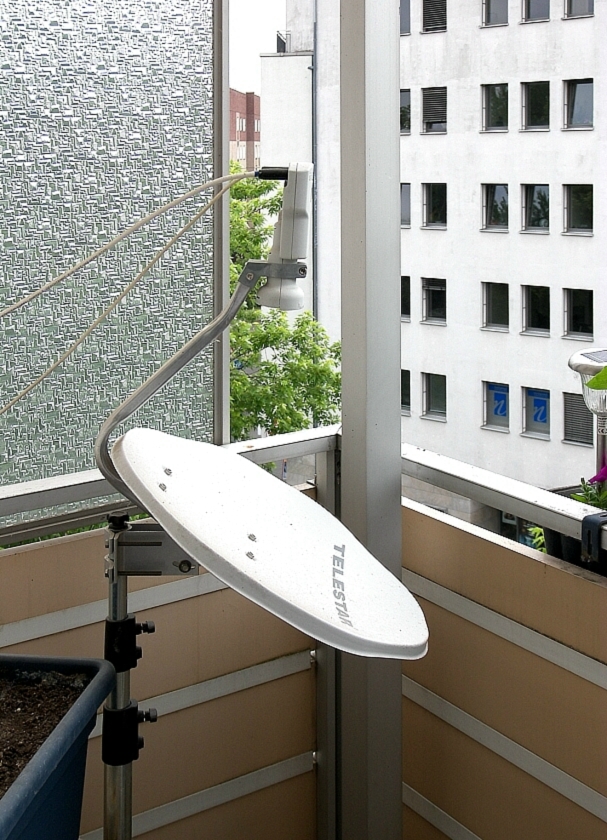 Offsetspiegel, liegend, mit Monoblock zum Empfang von Astra 19,2° Ost und Hot Bird 13° Ost. Ein Vorteil der quasi Überkopf-Montage, auf dem linken Bild gut erkennbar, besteht in dem nach oben "auskragenden" Arm, der auf einem knapp bemessenen Balkon durchaus ein paar Zentimeter Platzersparnis gegenüber der gängigen Vormastmontage einbringen kann.