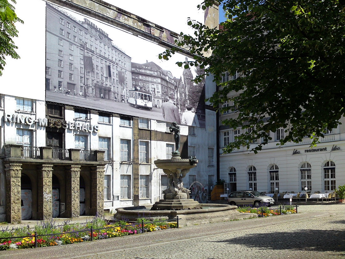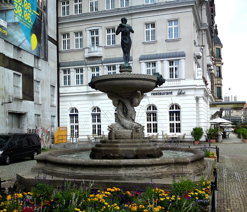 Wo heute das Ring-Messehaus steht, befand sich (um 1900) Geibels Garten. Die Verlagsbuchhändler Dürr und Geibel widmeten diesen Brunnen den Villersschwestern. Die ältere war die Schwiegermutter Geibels, die jüngere die erste Gattin von Dürr. 1903 wurde der Brunnen vom Bildhauer Max Unger errichtet. Quelle: mdr FIGARO 2012 Die Figur wurde zweimal ersetzt.