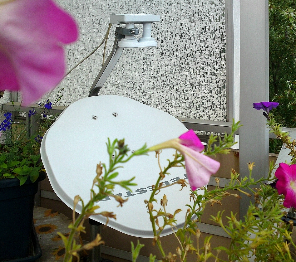 Offsetspiegel, liegend, mit Monoblock zum Empfang von Astra 19,2° Ost und Hot Bird 13° Ost. Ein Vorteil der quasi Überkopf-Montage, auf dem linken Bild gut erkennbar, besteht in dem nach oben "auskragenden" Arm, der auf einem knapp bemessenen Balkon durchaus ein paar Zentimeter Platzersparnis gegenüber der gängigen Vormastmontage einbringen kann.