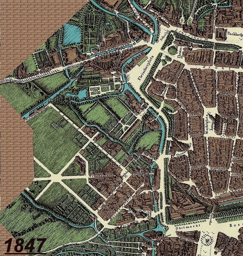 Auf dem Ausschnitt von 1847 ist die beginnende Bebauung um den Reichelsplatz (heute Dorotheenplatz) sowie nördlich der Kolonnadenstraße erkennbar. Das Kolonnadenviertel darf daher mit Fug und Recht als Kerngebiet oder Herzstück der Westvorstadt bezeichnet werden.