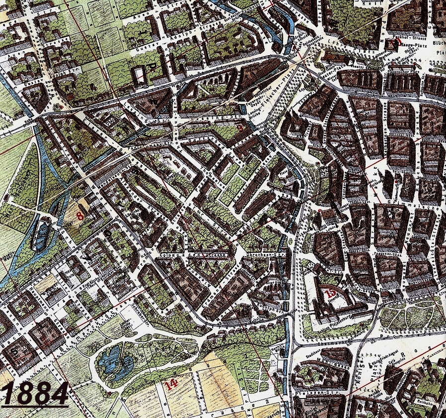 Auf der Karte von 1884 gut zu sehen sind nördlich der weitgehend erschlossenen Inneren Westvorstadt die voranschreitende Bebauung des Waldstraßenviertels sowie die Planung des Musikerviertels im Süden.