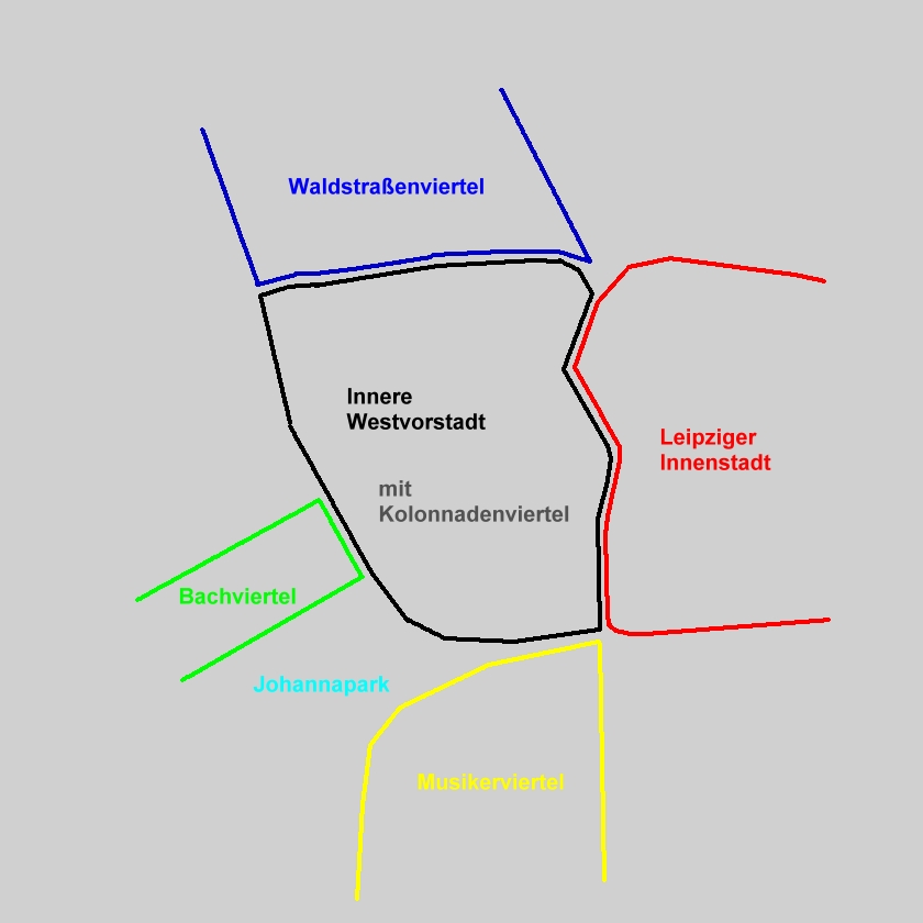 Als Westvorstadt (ohne "Innere") wird das gesamte Gebiet westlich der Leipziger Innenstadt bezeichnet..